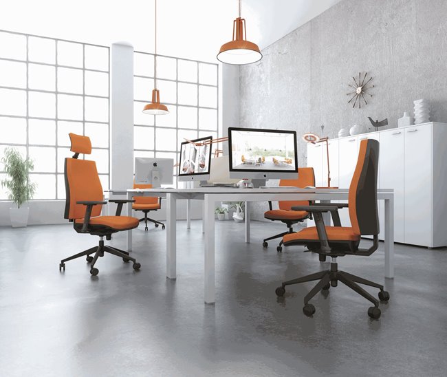 Darba krēsls ar sinhrono mehānismu ar 5 fiksēšanas pozīcijām, ar vai bez regulējama galvas balsta, sēdeklis un atzveltne no PU putām, sēdekļa augstums tiek regulēts ar gāzes pacēlājmehānismu 100 mm amplitūdā, regulējams sēdekļa dziļums, regulējams atzveltnes augstums, (7 pozīcijas) fiksēti vai regulējami roku balsti, plastmasas vai pulēta alumīnija kāja ar mīkstiem ritentiņiem, krēsla nestspēja - 130 kg.